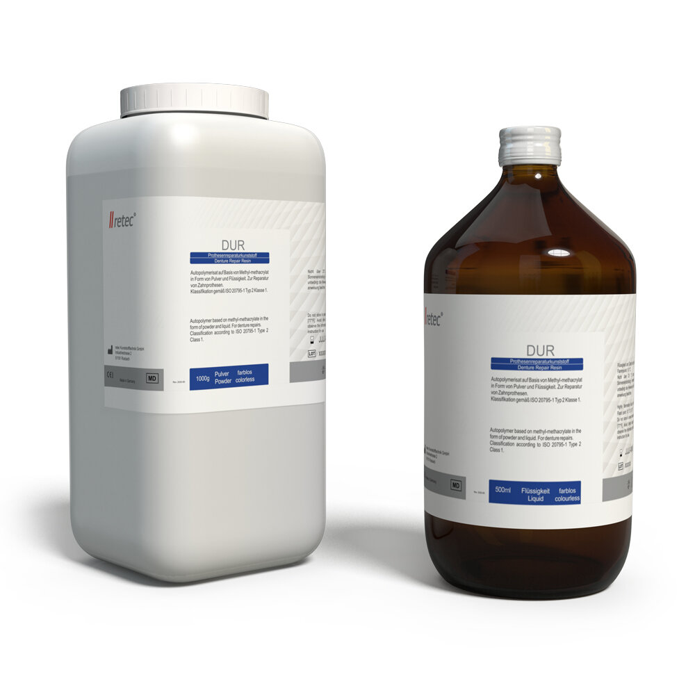 retec® DUR ist ein schnellhärtender autopolymerisierender Reparatur-Kunststoff für die sichere und effiziente Wiederherstellung von Prothesen. Aufgrund der tropfbar-flüssigen Konsistenz ist eine Aushärtung in dünnen Schichten und ohne technischen Aufwand möglich.